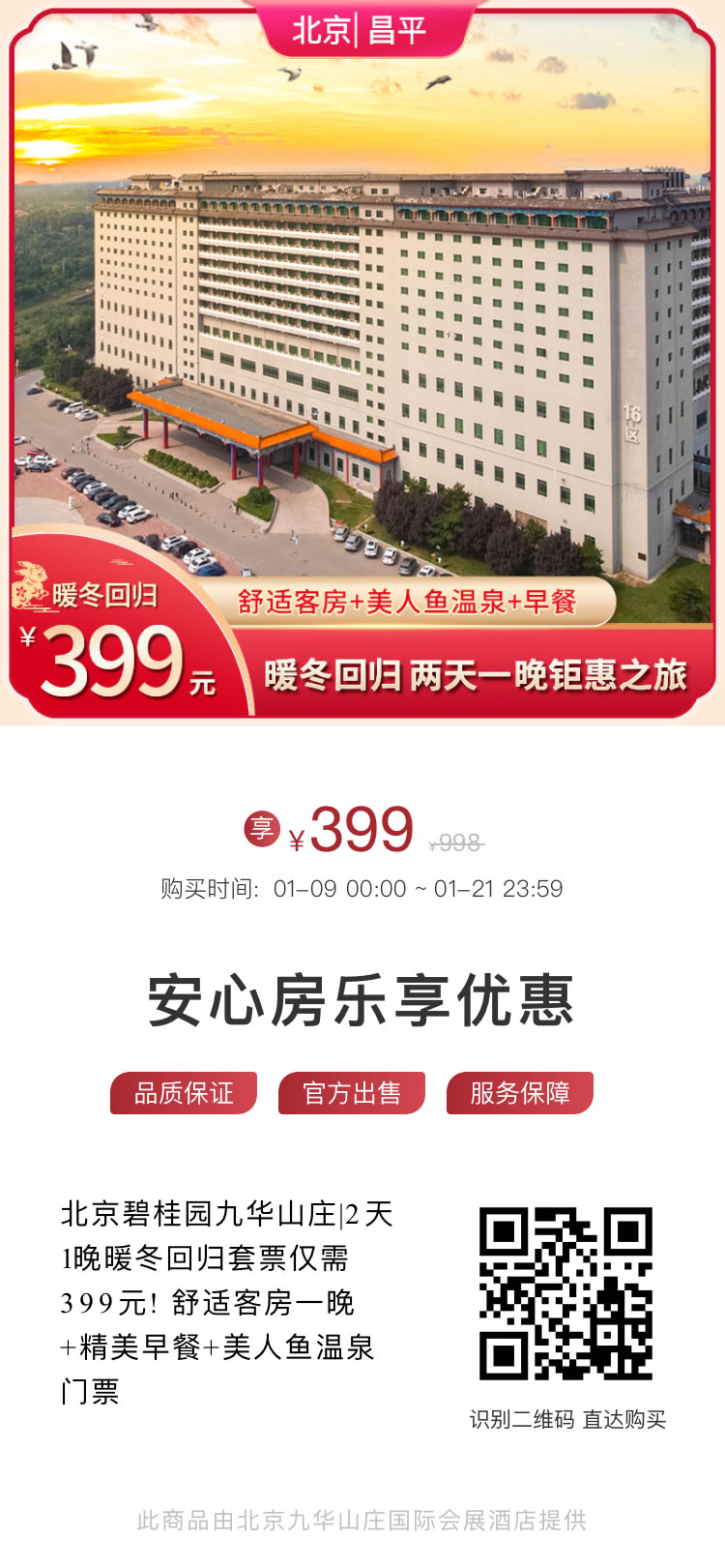 北京碧桂园九华山庄|2天1晚暖冬回归套票仅需399元! 舒适客房一晚+精美早餐+美人鱼温泉门票