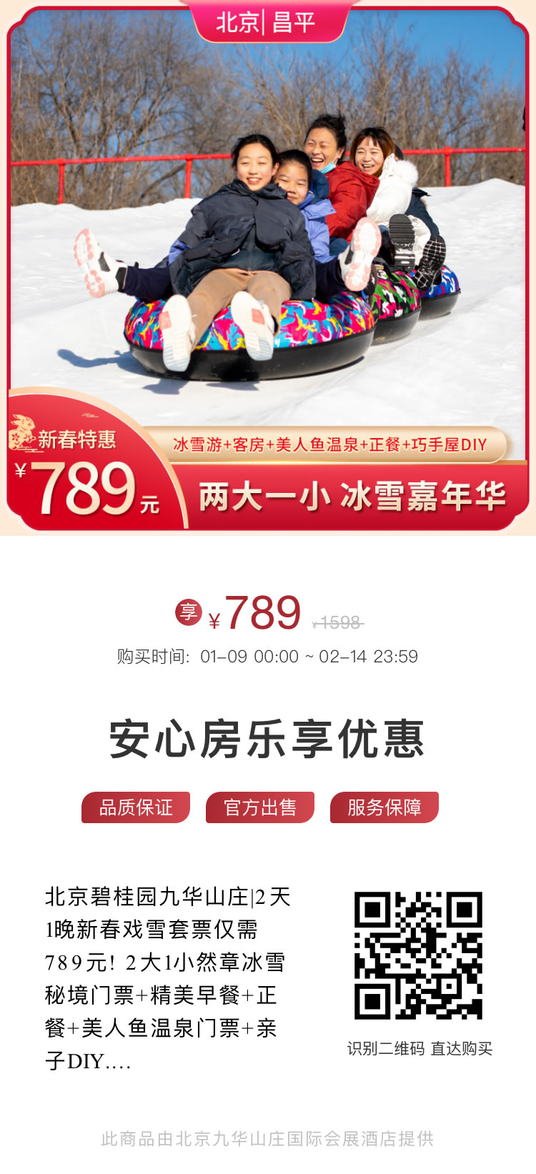 北京碧桂园九华山庄|2天1晚新春戏雪套票仅需789元! 2大1小然章冰雪秘境门票+精美早餐+正餐+美人鱼温泉门票+亲子DIY物品一份+巧手屋儿童乐园