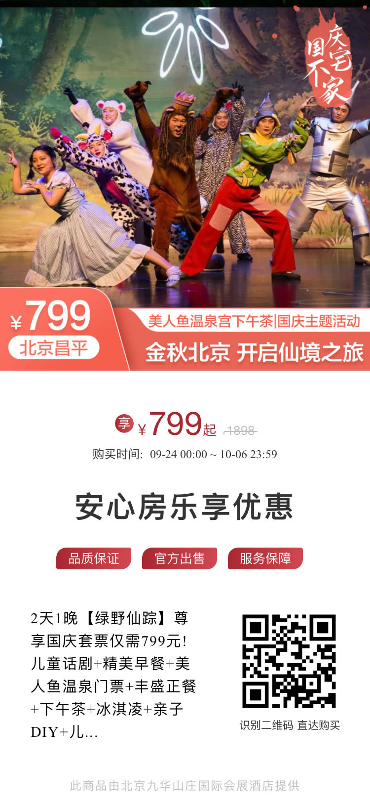 2天1晚【绿野仙踪】尊享国庆套票仅需799元! 儿童话剧+精美早餐+美人鱼温泉门票+丰盛正餐+下午茶+冰淇凌+亲子DIY+儿童充气城堡+儿童娱乐体验区+儿童电影+乒乓球/台球/健身房三选一1小时!