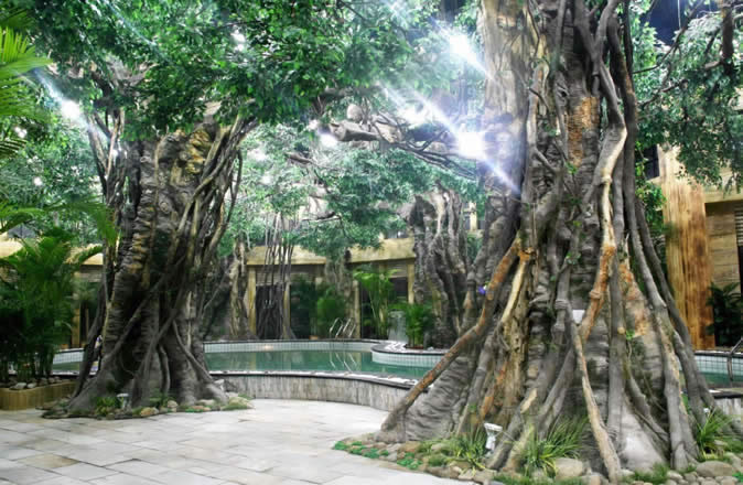 温泉养生会馆,建筑面积约8000㎡,建筑形式采用中式简化风格,简洁明快,主要针对以商务休闲为主的中高档消费群体。室内通过多种亚热带绿植营造出热带雨林的气候环境,以温泉文化为主线,结合了东西方温泉特色,软件硬件相互配合,提出温泉健康的新理念。一层湿区包括水中健身区、按摩击打区(气泡按摩浴、水帘幕冲击浴、胸背按摩浴、气泡浴等)、保健水疗区(木桶浴、漩涡浴、腰足静泡浴、温差浴等)、特殊疗效区(人参浴、当归浴、芦荟浴、灵芝浴、薄荷浴、玫瑰浴、红酒浴、牛奶浴、花瓣浴、死海矿物泥浴、盐雾浴等)、室外温泉区以及冰雪屋等。二层干区有香熏、玉石床、休息大厅、技师按摩等。另外,快捷方便的体检项目,为事业型群体的亚健康状况提出体贴入微的关怀和指导性建议,体现了以人为本的经营理念。通过连廊,可达商业街的瑜伽养生、美容瘦身、营养餐厅、网吧、茶吧、书吧、视听、台球、乒乓、射击等项目。